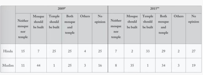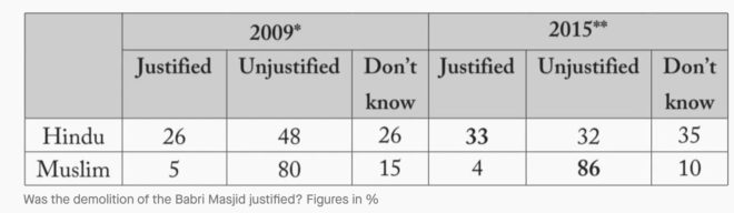سورس: این ای ایس ۲۰۰۹، سی ایس ڈی ایس۔لوک۔نیتی ڈیٹا یونٹ، سروے برائے مذہبی رجحان ۲۰۱۵، سی ایس ڈی ایس۔لوک۔نیتی ڈیٹا یونٹ
