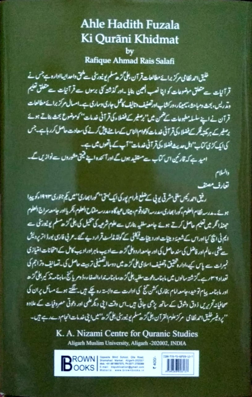 عجیب اتفاق ہے کہ اس کتاب کو مولانا نوشہروی نے ۲۹/مارچ۱۹۳۷ء کوآل انڈیا مسلم ایجوکیشنل کا نفرنس کی پچاس سالہ جوبلی کے موقع پر کانفرنس کی موقر انتظامیہ کی دعوت پرعلی گڑھ مسلم یونیورسٹی کے اسٹریچی ہال میں ایک مقالے کی صورت میں پیش کیا تھااور آج اس کے ۸۲/سالوں کے بعد اسی جماعت کے ایک ادنی خادم کو یونیورسٹی کے ایک اہم شعبہ”پروفیسر خلیق احمد نظامی سنٹر فار قرآنک اسٹڈیز،علی گڑھ مسلم یونیورسٹی،علی گڑھ،نے ”اہل حدیث فضلاء کی قرآنی خدمات“پر کتاب لکھنے کی دعوت دی ہے۔یہ میرے لیے سعادت کی بات ہے کہ اللہ نے مجھے اس کا موقع عطا فرمایا،میں سنٹر کے ڈائرکٹر پروفیسر عبدالرحیم قدوائی صاحب کا احسان مند اور مشکور ہوں کہ انھوں نے اس موضوع پر کتاب لکھنے کی دعوت دی اور برصغیر کے مختلف مکاتب فکر کے فضلاء کی تفسیری خدمات کے سلسلۂ مطبوعات میں اسے شامل فرمایا۔